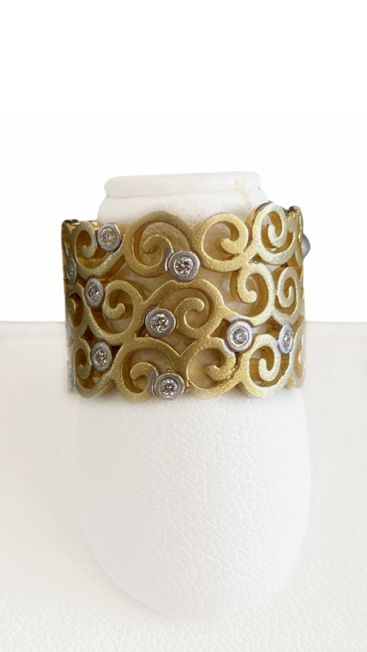 Crafted with 14k brushed yellow gold, this exquisite filigree ring radiates luxury and elegance. The intricate scrollwork design is meticulously enhanced by the shimmering presence of 12 round diamonds, totaling .08 carats, strategically placed to catch the light and add a touch of brilliance. This piece seamlessly combines classic refinement with modern sophistication, making it a timeless addition to any jewelry collection.
