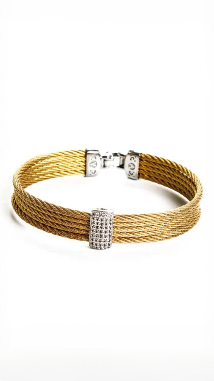 The ALOR 18K Gold Over Stainless .55ct Diamonds Cuff exudes timeless elegance, featuring meticulously crafted gold-plated stainless steel strands that intertwine to form a luxurious silhouette. This stunning bracelet is accentuated by a central, gleaming diamond-encrusted clasp, boasting a total of .55 carats of brilliant-cut diamonds. Perfectly merging contemporary design with classic sophistication, this exquisite cuff is a statement piece that embodies both strength and beauty.