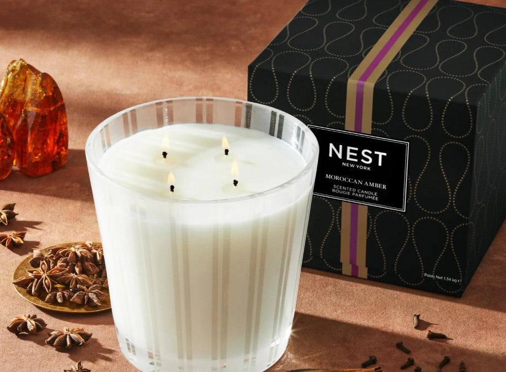 Elevate your senses and enhance your ambiance with the NEST Luxury 4 Wick Candle. Encased in a stylish, ribbed glass vessel, this elegant candle embodies sophistication and tranquility, offering over 100 hours of captivating fragrance. Available in a range of exquisite aromas, including the refreshing zest of Grapefruit, the serene allure of Bamboo, the exotic warmth of Moroccan Amber, and the delicate sweetness of Himalayan Salt & Rosewater, each variant promises a unique olfactory journey. Perfect for any space, this luxury candle serves not only as a source of light but also as a statement of impeccable taste.