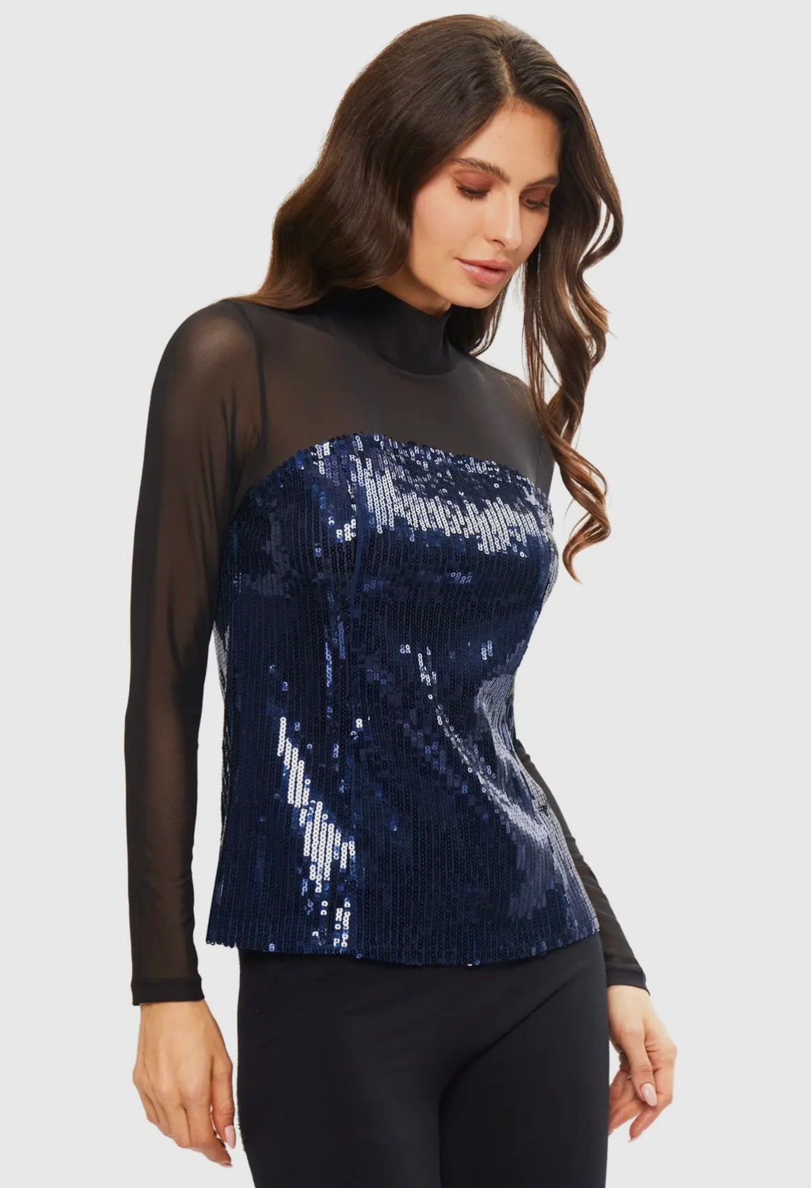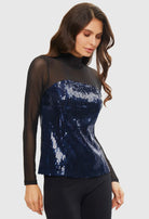 Shine bright in our dazzling sequined top; a show stopping piece perfect for any special occasion. The top features navy sequin bodice that catch the light beautifully seating a shimmer with every moment.  The high-neck design and sheer black long sleeves add a touch of sophistication.