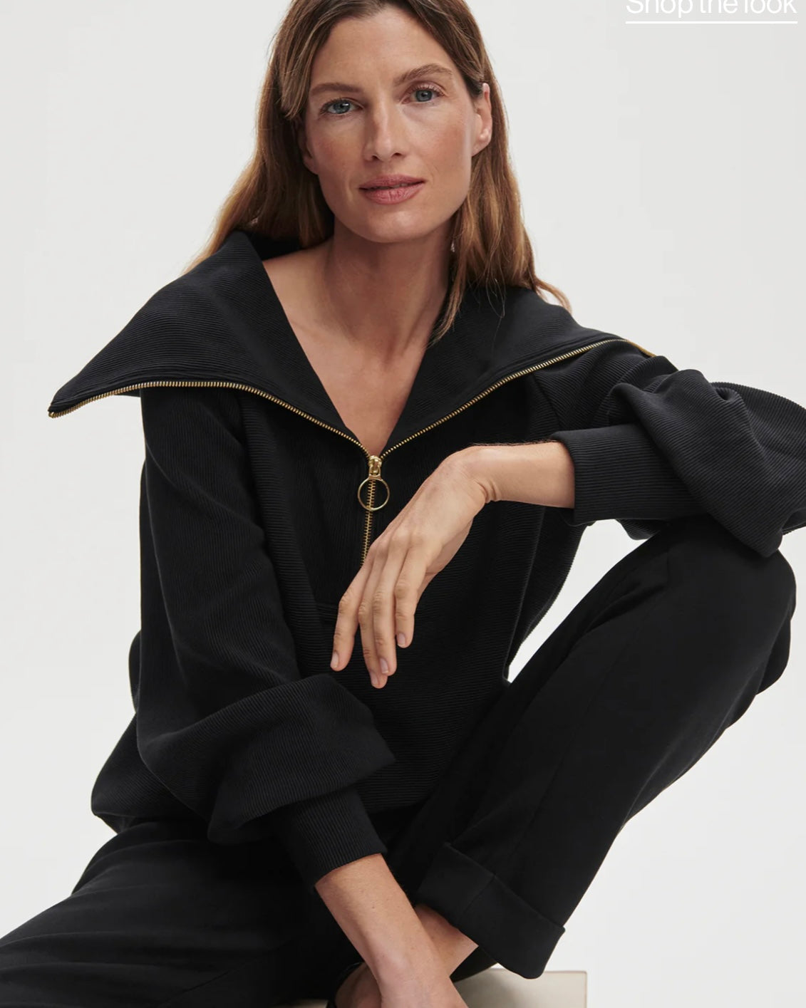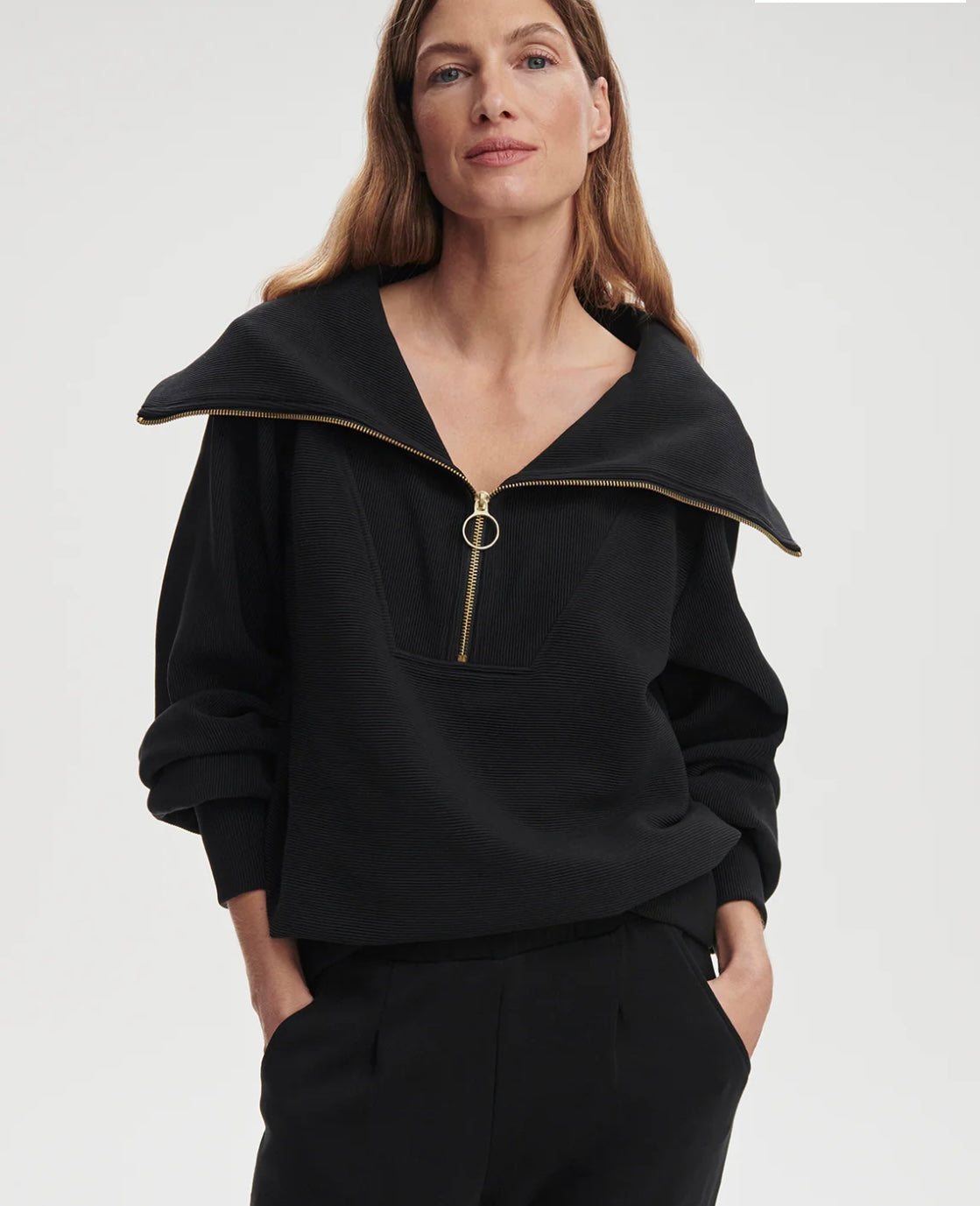 This versatile half-zip pullover is produced in our key Ottoman rib, with a high, oversized collar, exaggerated sleeves and a contemporary hoop zipper. Designed to be oversized, wear over leggings or sweatpants to achieve your desired look.