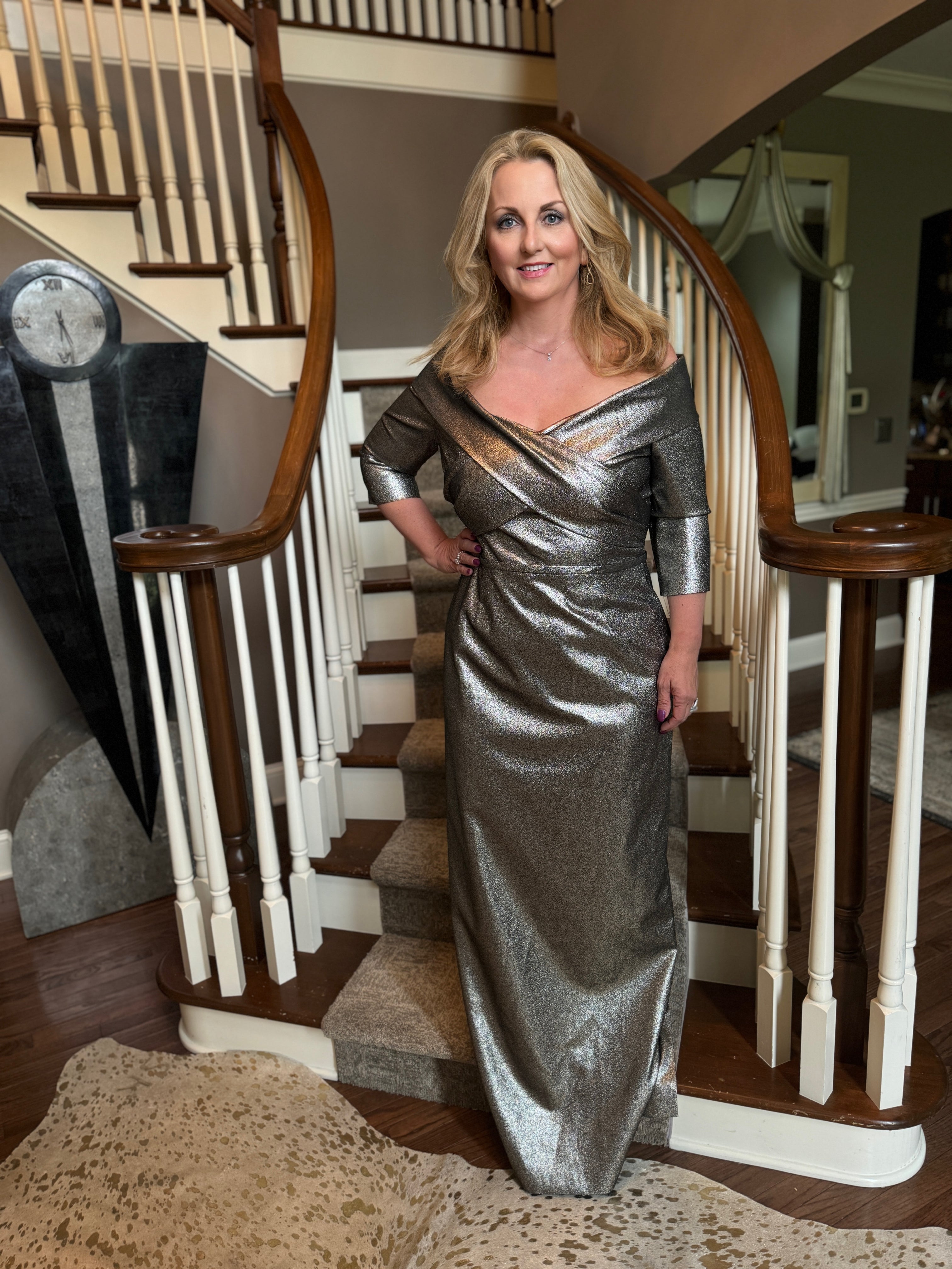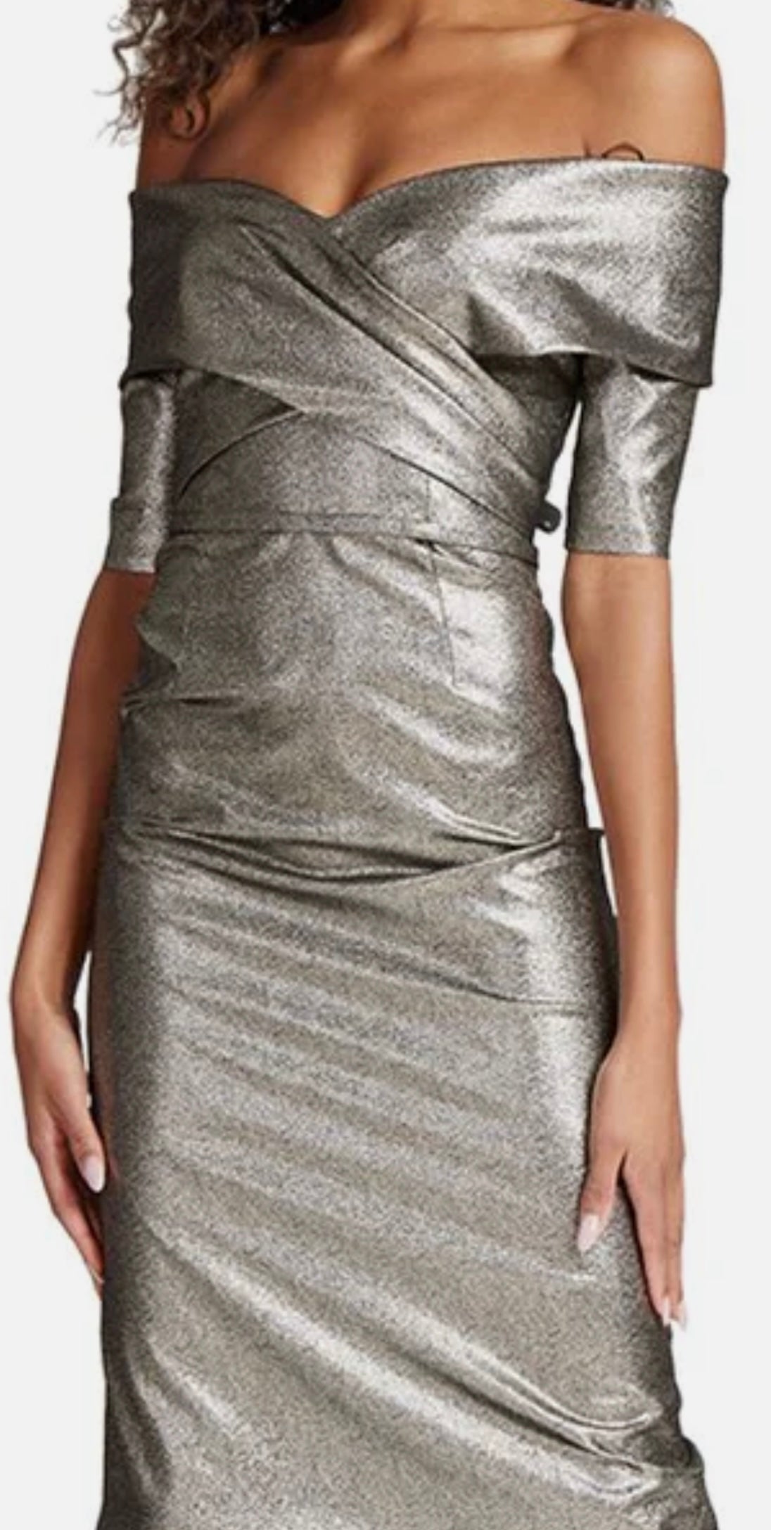 Effortlessly versatile and undeniably elegant, the Metallic Portrait Collar Gown by Teri Jon exudes sophistication with its stunning ability to shimmer in both silver and gold hues under any light. This exquisite gown, featuring a flattering twist portrait collar and 3/4 sleeves, is meticulously crafted with a hint of stretch from 4% elastane to ensure both comfort and a perfect fit. The detailed thin belt accentuates the waist, making it an ideal choice for any sophisticated event, from a timeless mother of the bride look to a distinguished gala affair. Fully lined for added luxury, this gown promises to dazzle and enchant with every wear.