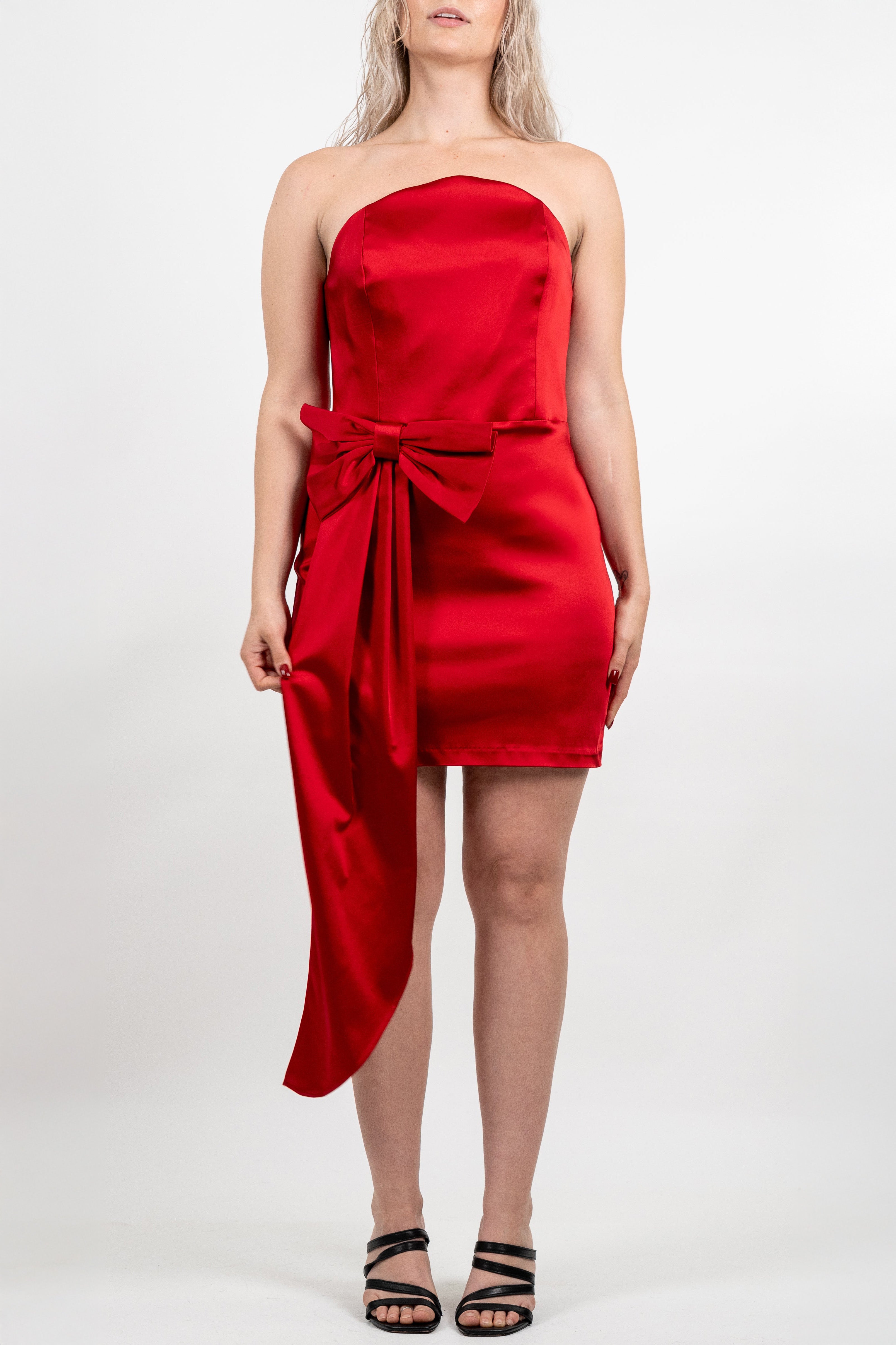 Elevate your evening wardrobe with this Amanda Uprichard strapless red mini dress, a striking fusion of boldness and elegance. Crafted from luxurious fabric, its sleek silhouette skims the body flawlessly, ensuring both comfort and allure. The exquisite bow detail at the waist enhances the dress's sophisticated charm, while its vibrant hue radiates confidence and poise. Perfect for making a memorable impression, this dress seamlessly combines modern style with timeless appeal.