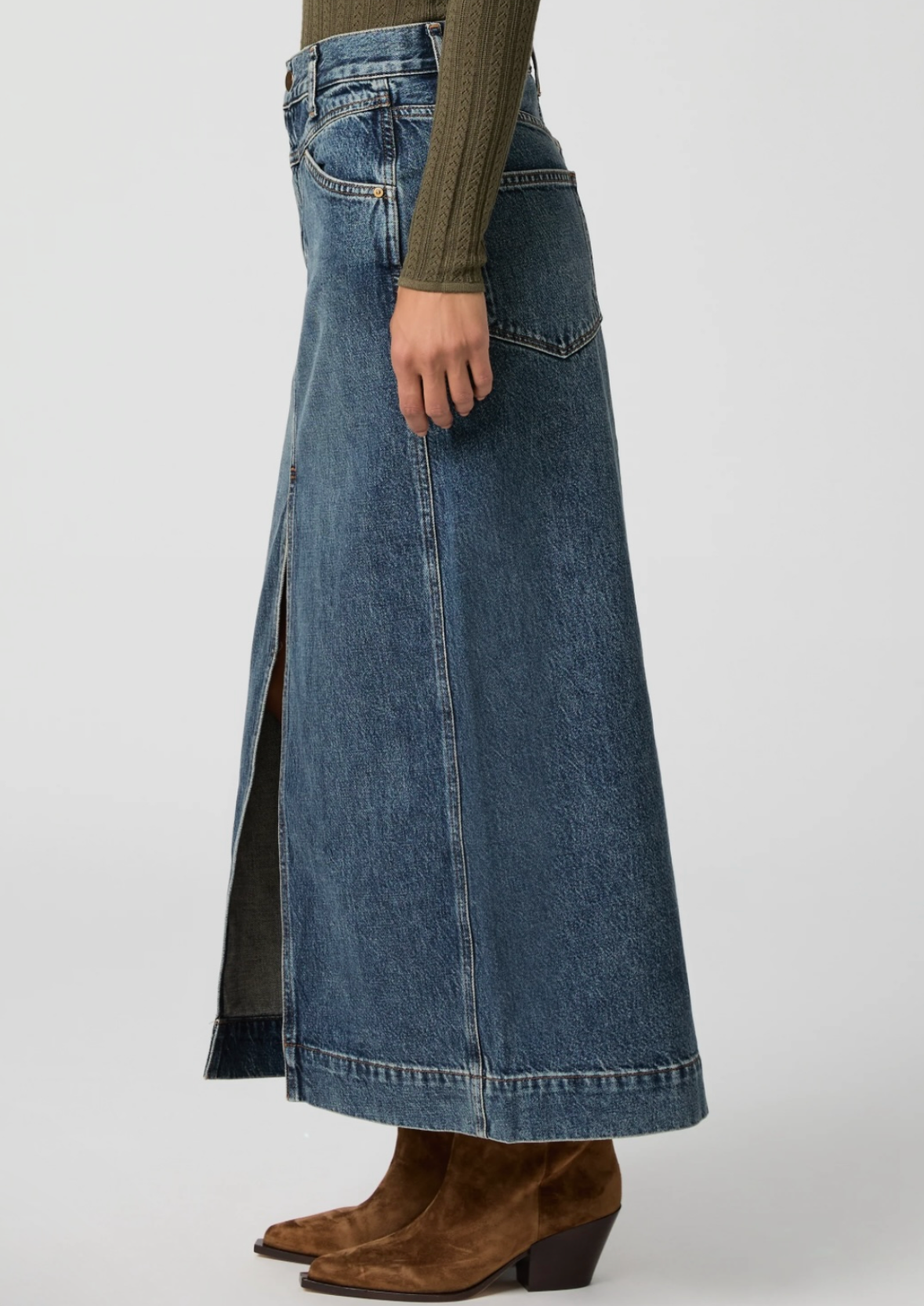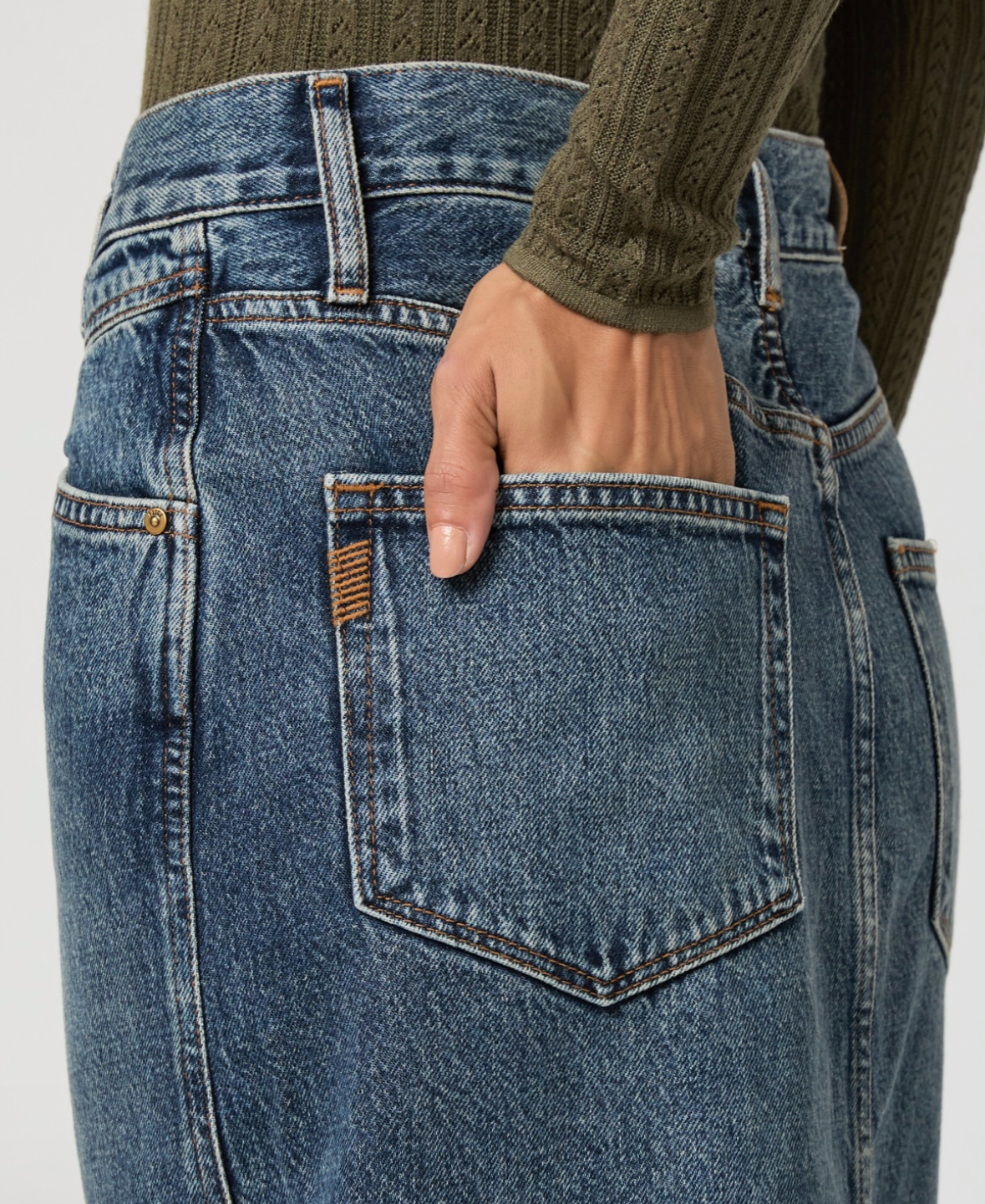 Crafted from our Heritage Rigid Denim in a vintage inspired tinted dark wash, this efforlessly cool ankle length denim skirt is designed with a low-slung, boxy fit, a front slit and antique gold hardware.