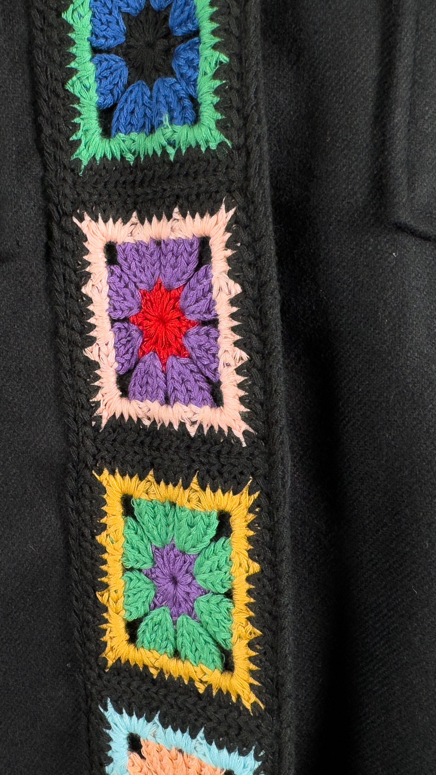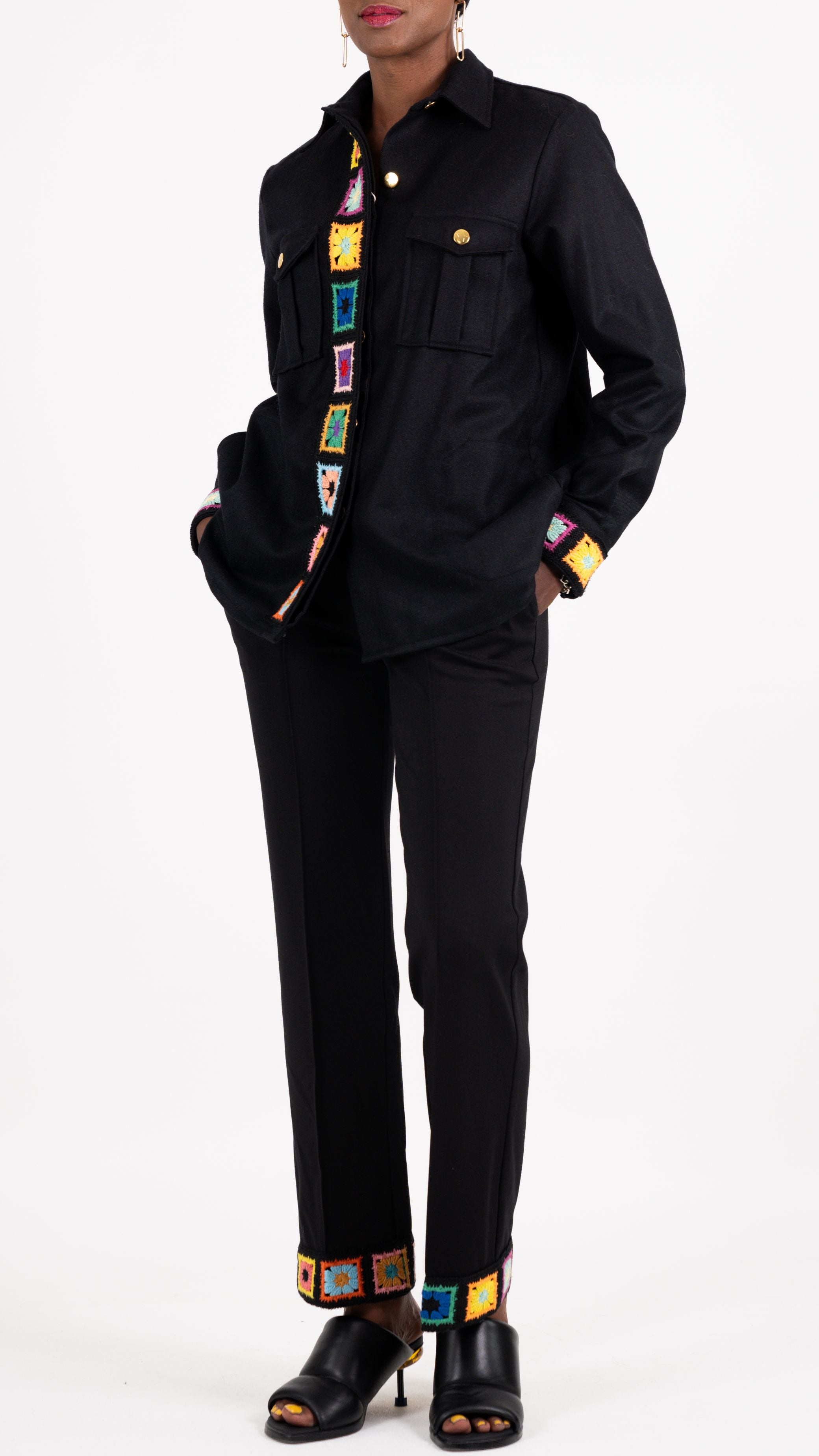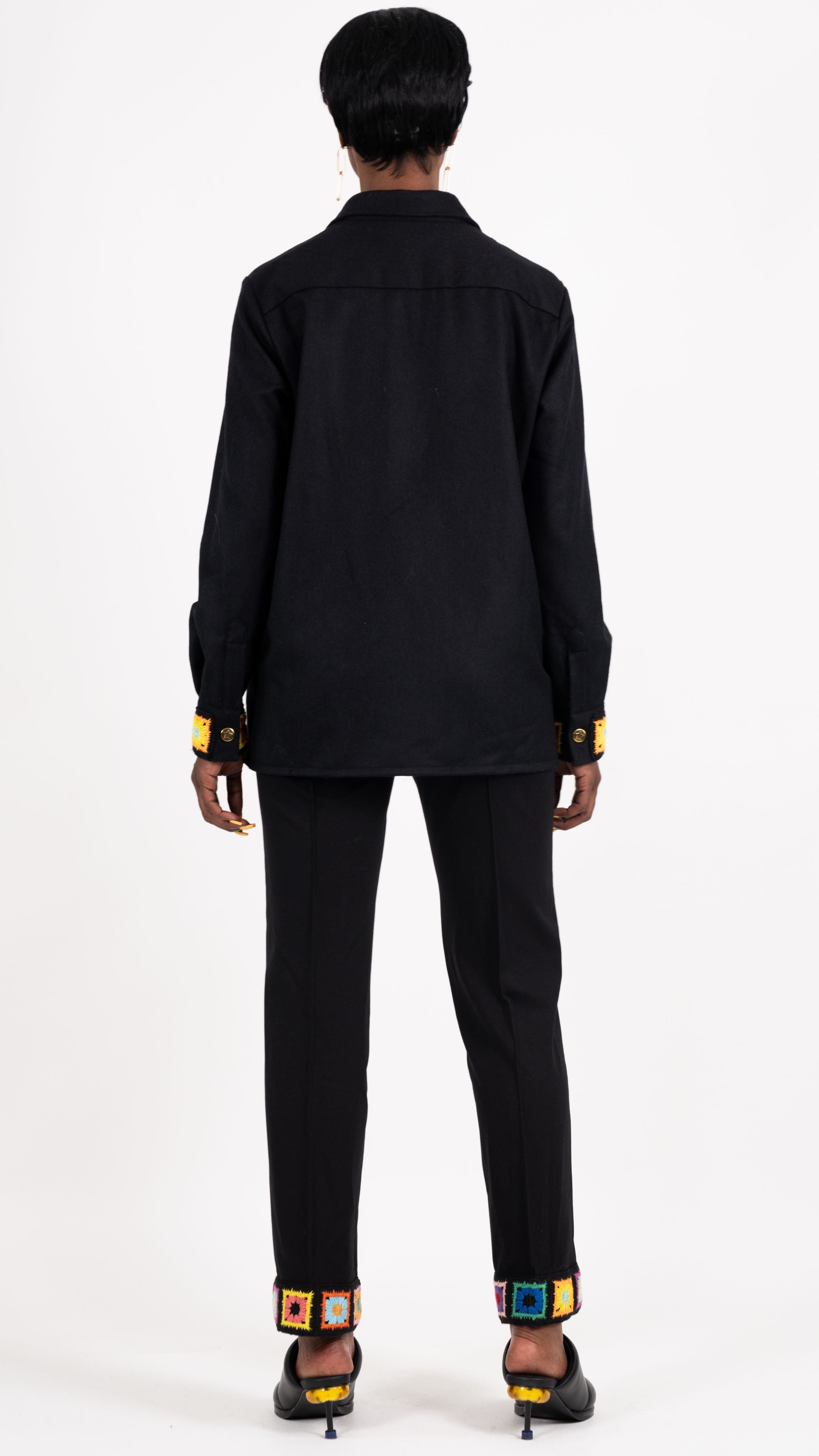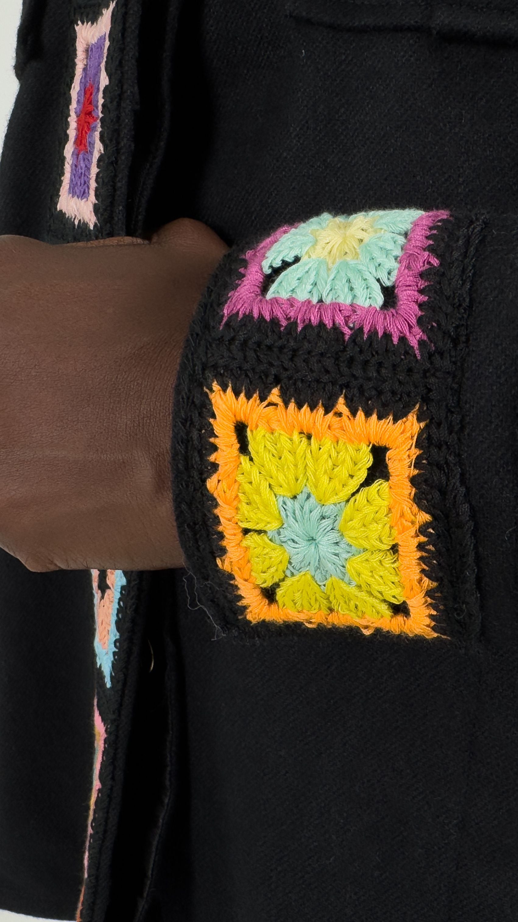 This Black Jacket by VILLAGALLO offers an exquisite blend of sophistication and unique artistry, featuring intricate crochet detail along the front placket, cuffs, and hem. The vibrant multicolor crochet accents create a striking contrast against the deep black fabric, making this jacket not only a statement piece but also a versatile addition to any wardrobe. Tailored with a classic silhouette, it boasts gold star buttons on the front pockets and sleeves, adding an elegant touch. Meticulously crafted from premium materials, this jacket ensures both comfort and style, effortlessly elevating any ensemble with its luxurious design.