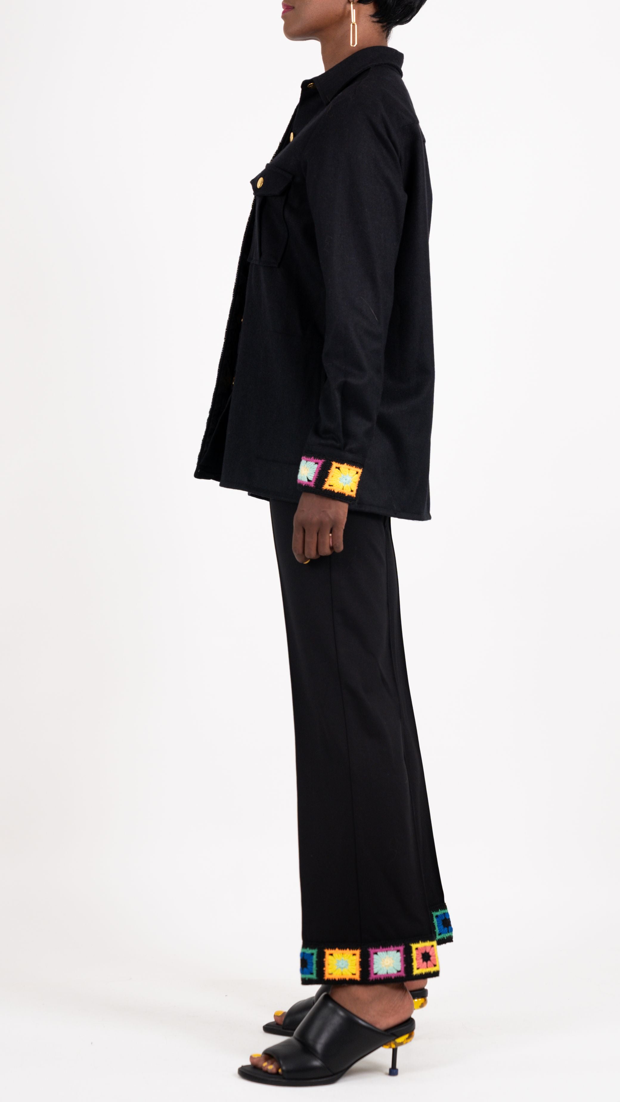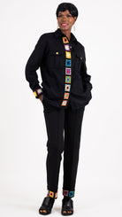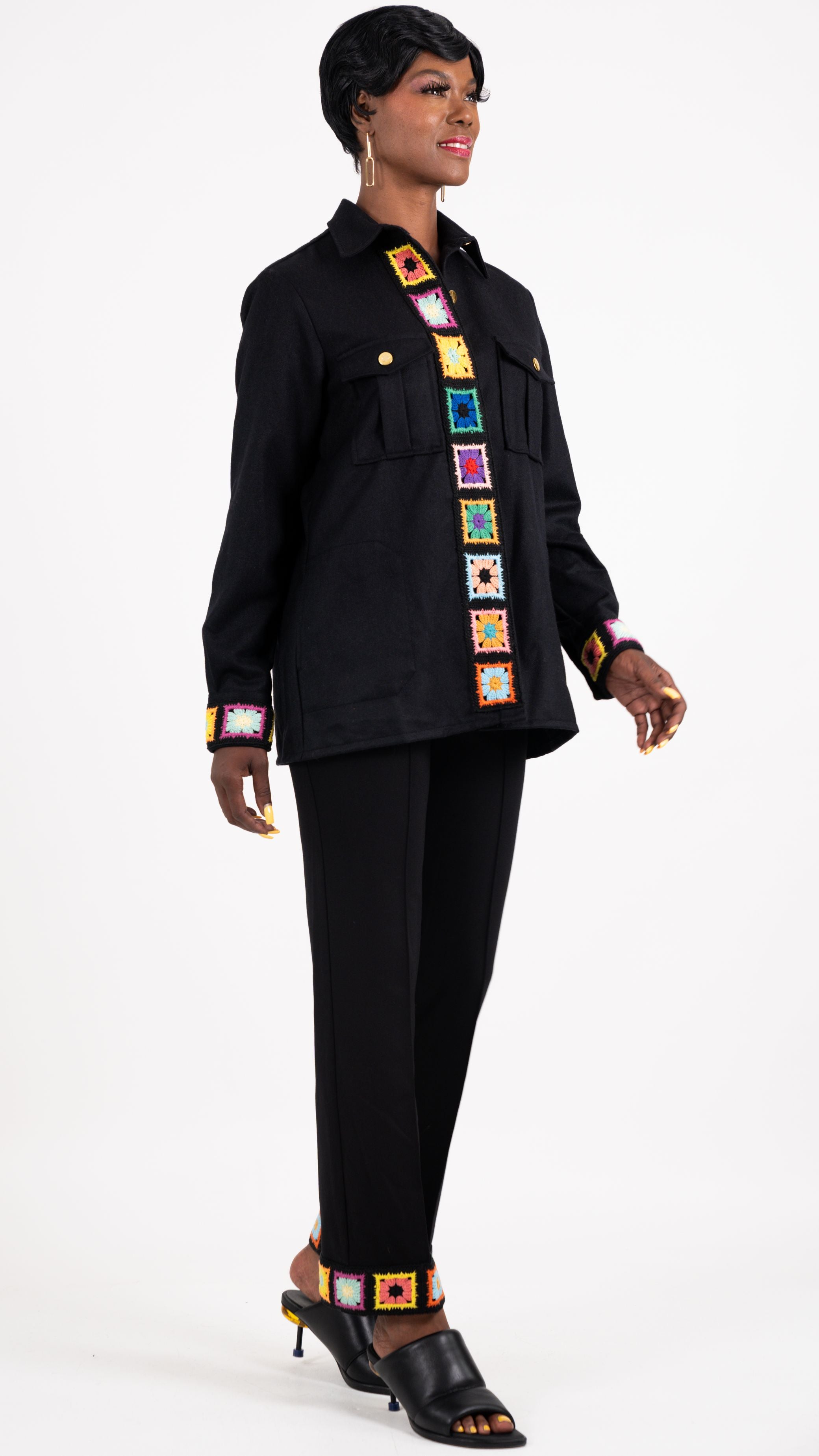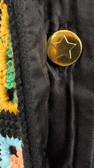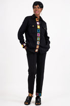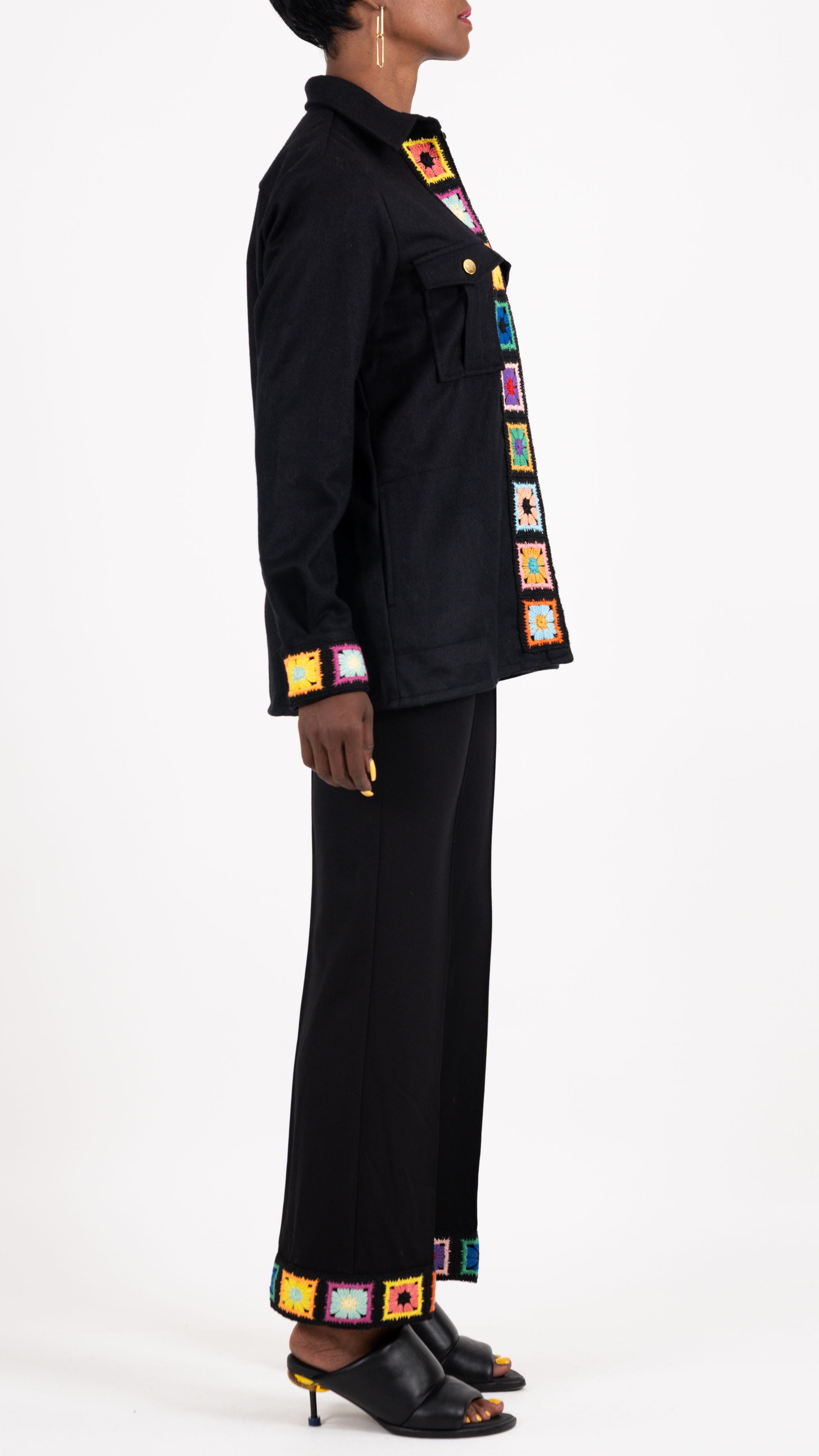 This Black Jacket by VILLAGALLO offers an exquisite blend of sophistication and unique artistry, featuring intricate crochet detail along the front placket, cuffs, and hem. The vibrant multicolor crochet accents create a striking contrast against the deep black fabric, making this jacket not only a statement piece but also a versatile addition to any wardrobe. Tailored with a classic silhouette, it boasts gold star buttons on the front pockets and sleeves, adding an elegant touch. Meticulously crafted from premium materials, this jacket ensures both comfort and style, effortlessly elevating any ensemble with its luxurious design.