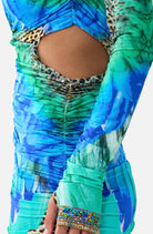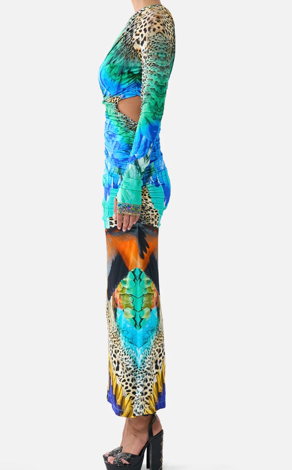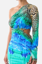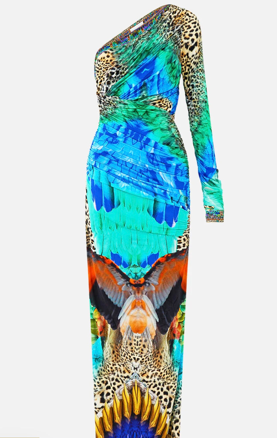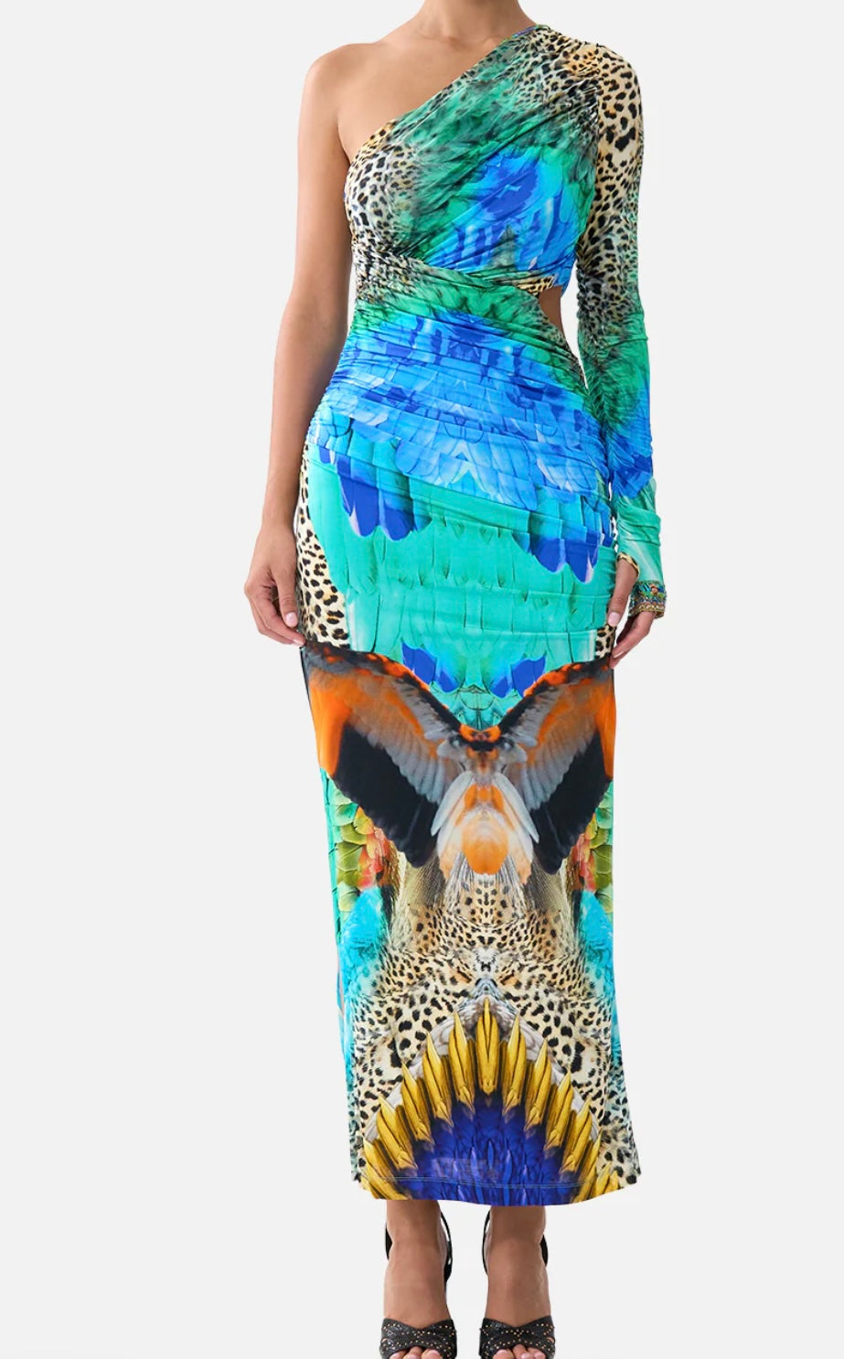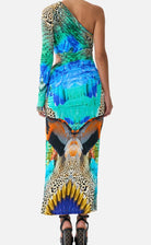 The Jungle Flight One Shoulder Jersey Cut Out Dress is a handcrafted silhouette designed by our in house artisans. Reimagined in an exclusive limited edition print, our knitted jersey dress features one shoulder cut that extends to an asymmetrical long sleeve. Its ruching details flatter the form while cut out details add allure and it's finished with an elongated, full length hemline.